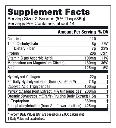 水解膠原蛋白,部分水解的瓜爾豆膠(SunFiber ®),辛酸MCT 油,人參根提取物(4%人參皂苷),有機冬蟲夏草(子實體提取物),L-色氨酸,磷脂酰膽鹼(來自向日葵卵磷脂),向日葵卵磷脂、可可、瓜爾豆膠、金合歡膠、黃原膠、天然香料、MCT油粉(來自高度精製椰子油和/或棕櫚仁油的辛酸和癸酸、木薯糊精)、甜菊葉提取物(從甜菊葉加工)、 天然香草香精、天然風味