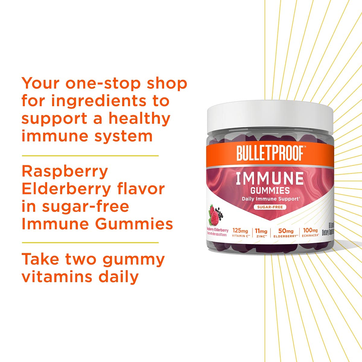 - Daily Immune Support: Bulletproof Immune Gummies are designed to strengthen your immunity with a powerful blend of vitamin C, zinc, elderberry and echinacea—without hidden sugar