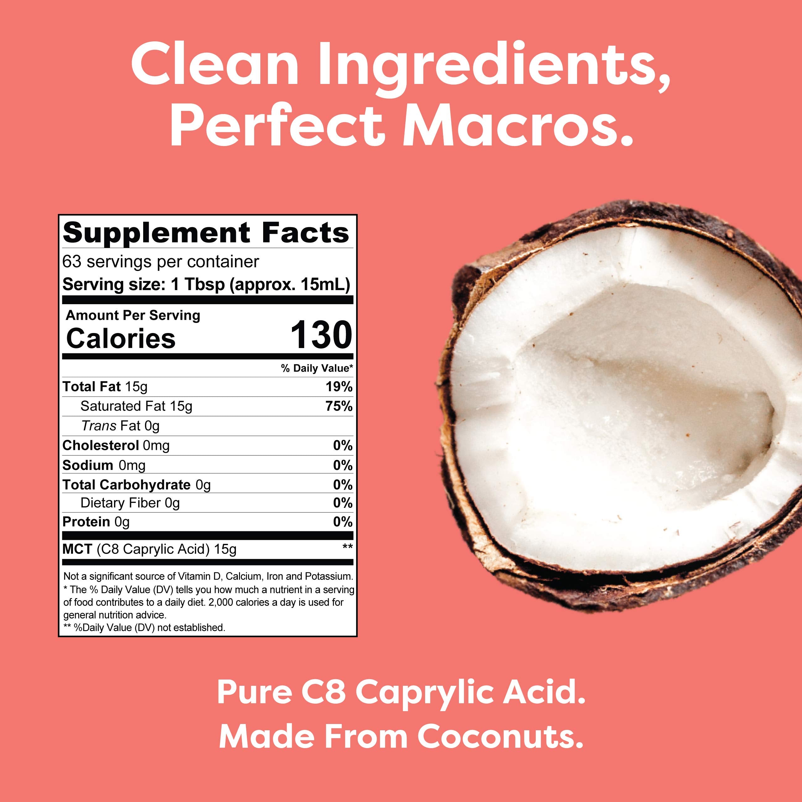 - 零碳水化合物。純淨、清潔的大腦燃料 — 與咖啡、酥油、冰沙或沙拉醬混合,補充容易消化、增強能量的 C8 脂肪酸。一種優質 MCT 油,可輕鬆與飲料混合,不會漂浮或分離。