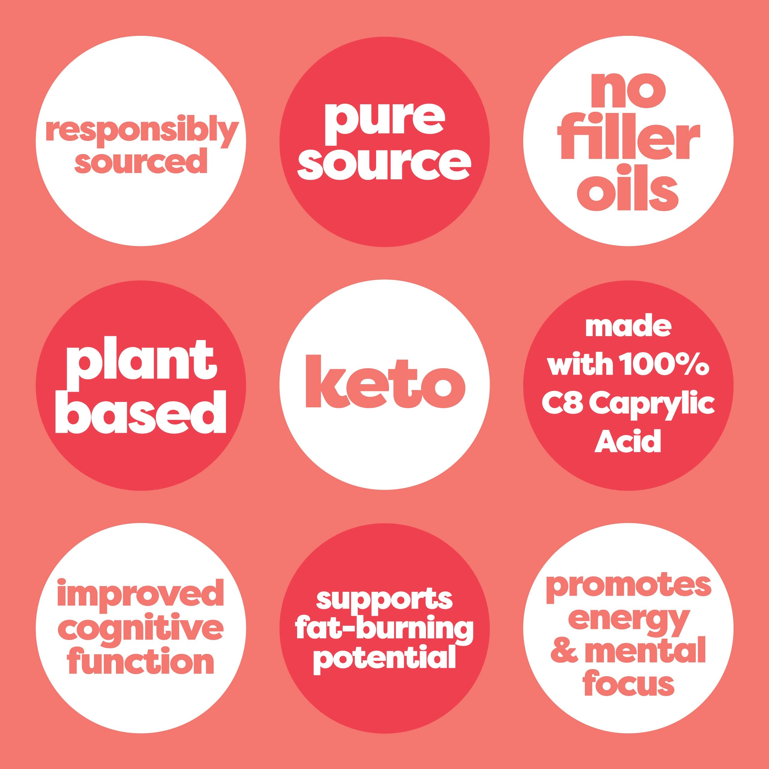 - 測試效力、純度和完整性 — MCT 油 C8(辛酸)是 MCT 的最有效形式,能夠提高酮體。作為低碳水化合物飲食中天然有效的能量來源,這種純 C8 提取物可將酮體增加約。 C10的3倍以上。