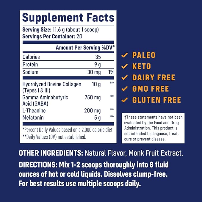 • I 型和 III 型純草飼水解膠原蛋白與令人放鬆的褪黑激素、洋甘菊和鎂相互結合,幫助睡得安穩,醒來時精神煥發