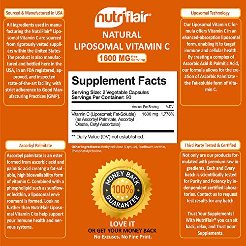 - 高單位的 1600 毫克、質量有保證的脂質體維生素 C:基於脂質體技術的行業領先的 1600 毫克脂質體維生素 C 複合物;每瓶含有 180 粒植物膠囊(植物來源),可供應整整 3 個月;不要滿足於 500 毫克或 1000 毫克脂質體 C 補充劑 – 體驗驚人的免疫和神經系統支持,促進膠原蛋白生成,以及我們每份 1600 毫克維生素 C 的更多好處