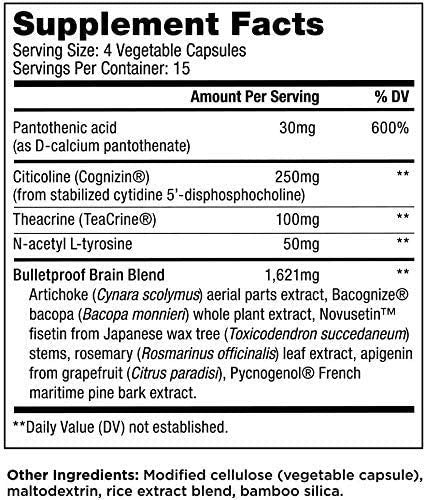 | 防彈大腦混合物 1,621mg朝鮮薊 ( Cynara scolymus) 地上部分提取物、Bacognize® bacopa ( Bacopa monnieri ) 全植物提取物日本蠟樹 ( Toxicodendron succedaneum ) 的Novusetin™ 非瑟酮、來自葡萄柚葉提取物的迷迭香 ( Rosmarinus officinalis )、柑橘類、碧容健® 法國海松樹皮提取物 | ||