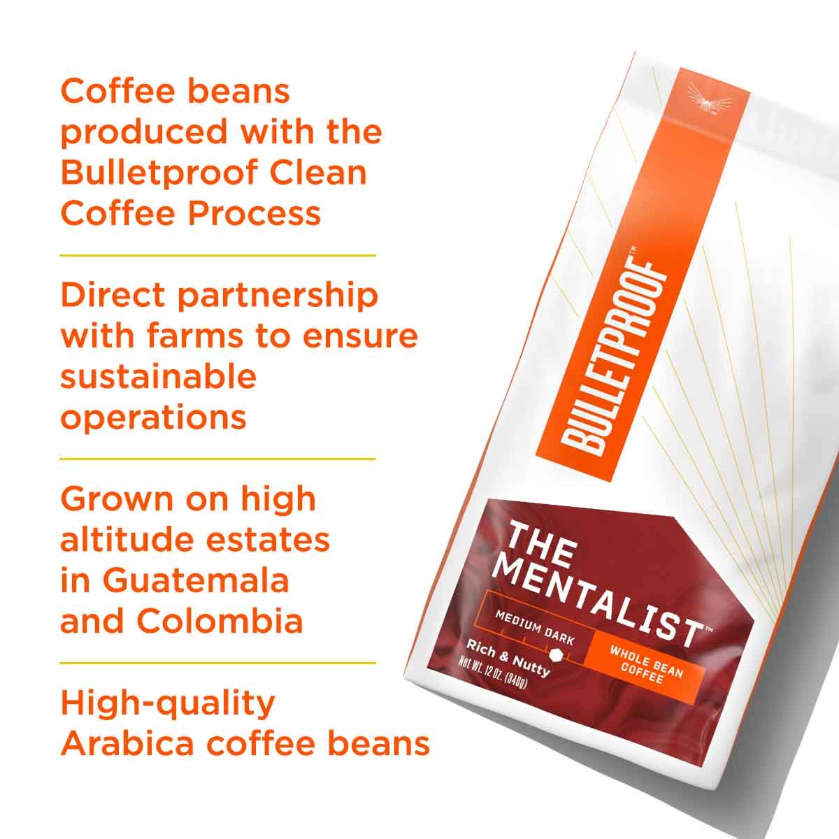 Details: The proprietary Bulletproof Process optimizes every step of coffee production for performance by minimizing the opportunity for performance-robbing mold toxins Ingesting mold toxins can contribute to chronic health issues Bulletproof Upgraded Coffee Beans are meticulously grown at high altitude on single estates in Guatemala, hand-harvested, carefully processed, handled and roasted to maintain maximum integrity and flavor The final roast then undergoes proprietary lab testing to verify that our coffee meets the Bulletproof quality and purity standards Jump-start your day by blending Upgraded Coffee with Bulletproof Brain Octane and grass-fed, unsalted butter to energize your mind and body for hours Supports regenerative antioxidant processes and minimized levels of mold toxins, you will feel the Bulletproof difference with your first cup Sourcing: Our coffee is carefully produced and lab tested using the Bulletproof Process to minimize toxins, so you can enjoy a pure cup of coffee worry-free After we pick the ripest cherries, we use the proprietary Bulletproof Process to create a special class of green coffee bean with minimized levels of harmful molds, bacteria, and toxins The beans are then medium roasted in small batches in the United States under the strictest conditions, which minimize the formation of toxins from the roasting process Roasting the beans enhances their naturally occurring antioxidant capacity and flavor to provide you with a cup of coffee that has a minimized level of performance-robbing mold-toxins