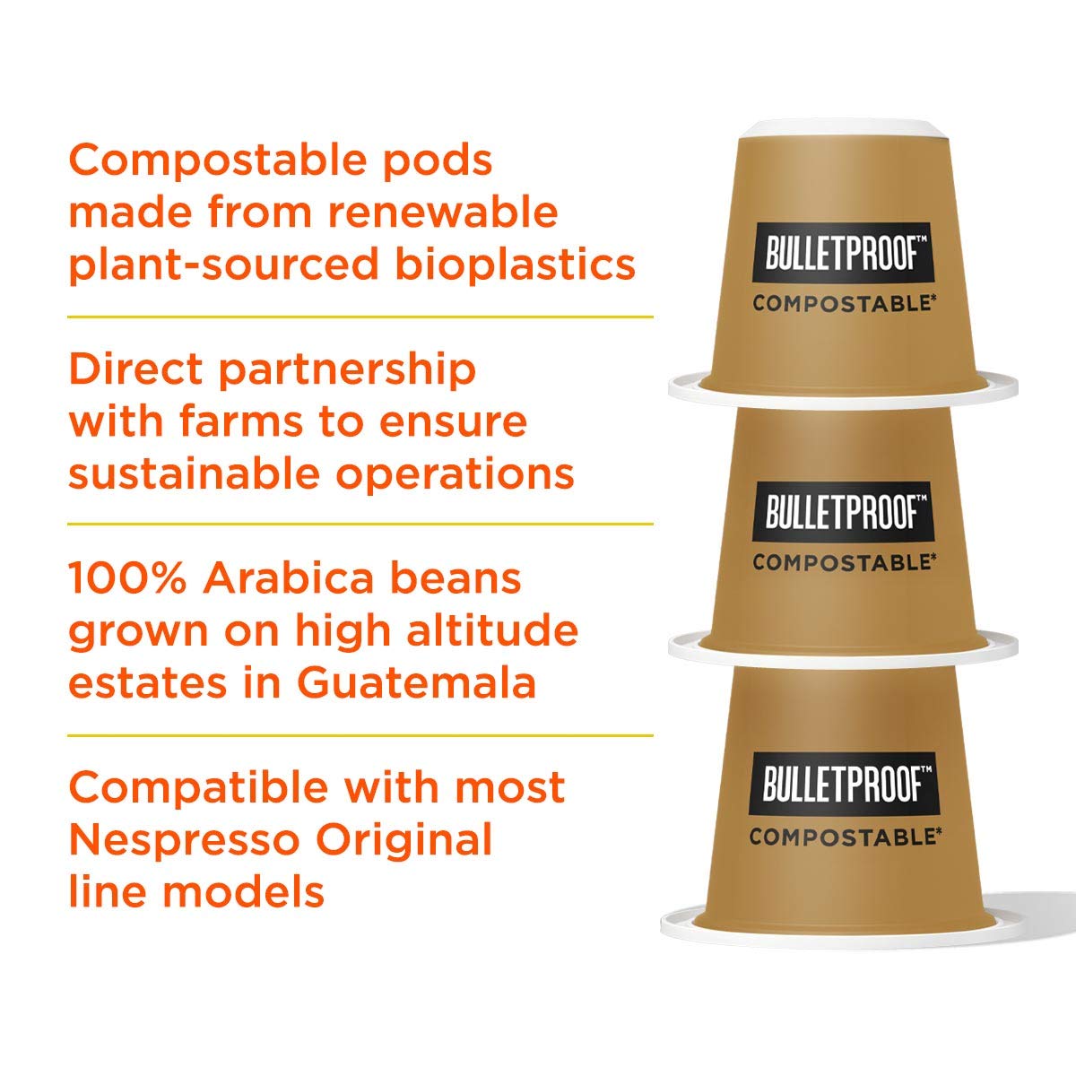 - Compostable Bulletproof Espresso Pods: This compostable pod is made from renewable plant-sourced bioplastics, is BPA-free and comes in a recyclable outer carton