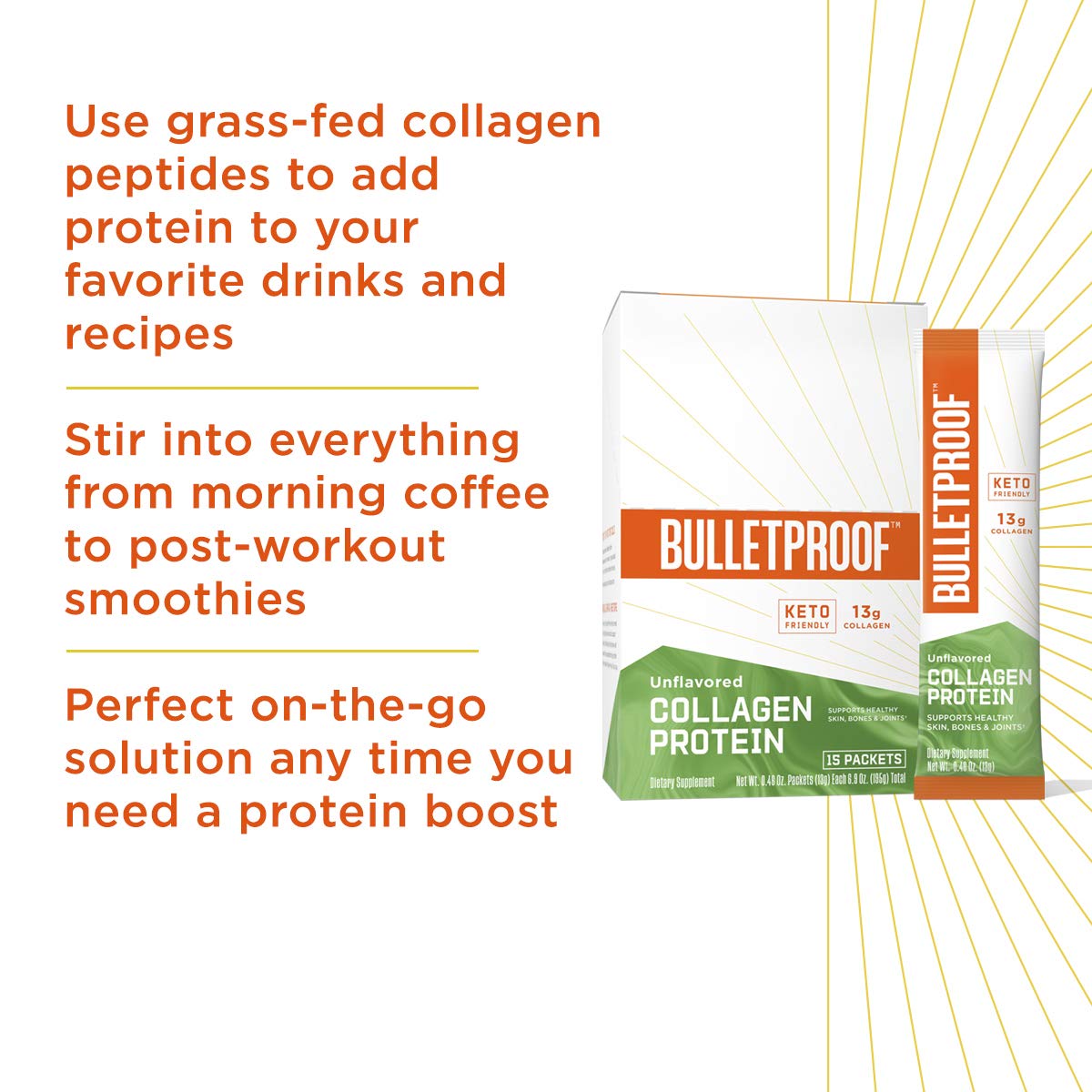 • 可方便快速補充與來自大骨湯相同的重要氨基酸,再也不需要花更多時間來準備與熬煮,此產品無味且可快速溶解不結塊,可添加入任何熱湯、冰飲甚至是防彈咖啡,是種簡便迅速補充蛋白質的方法