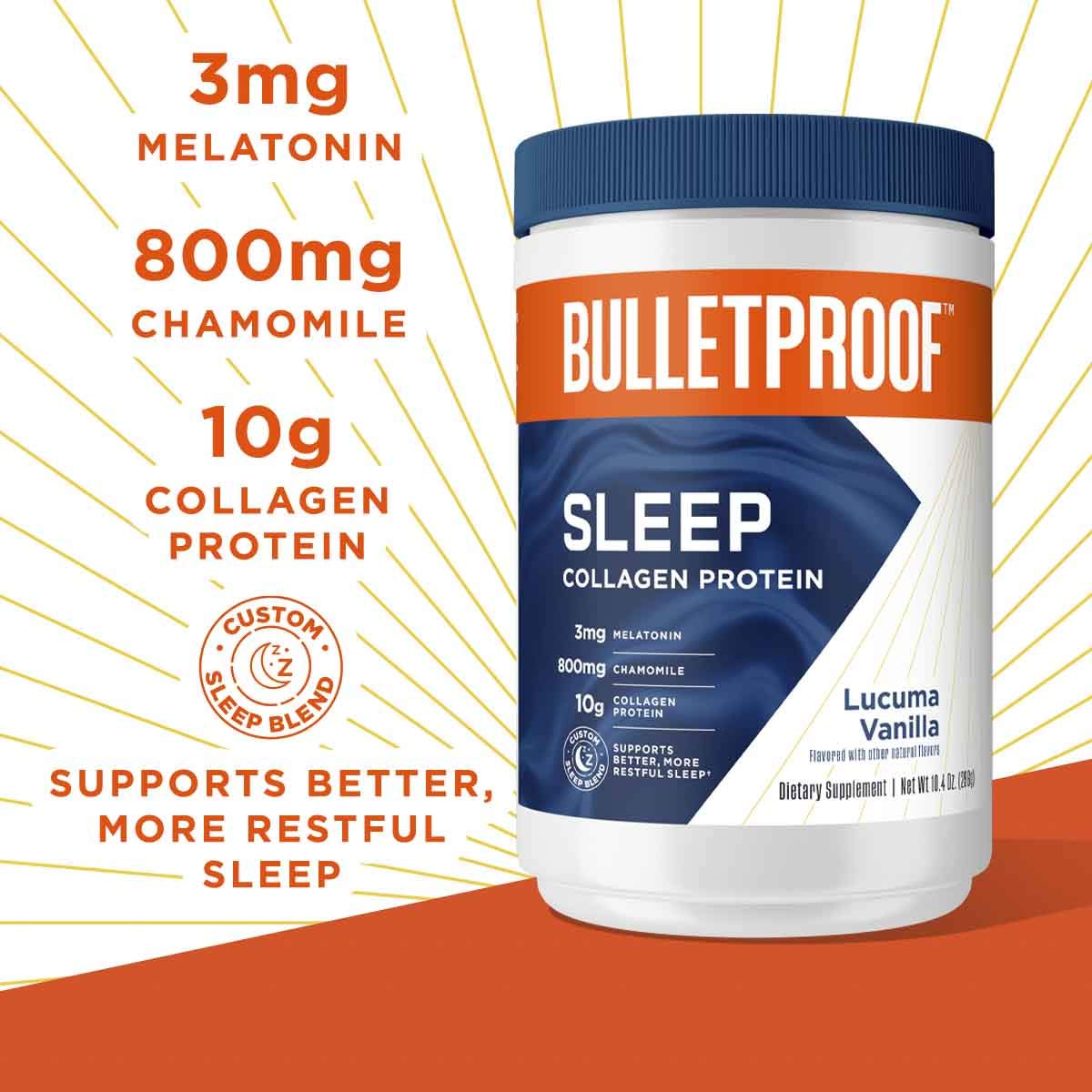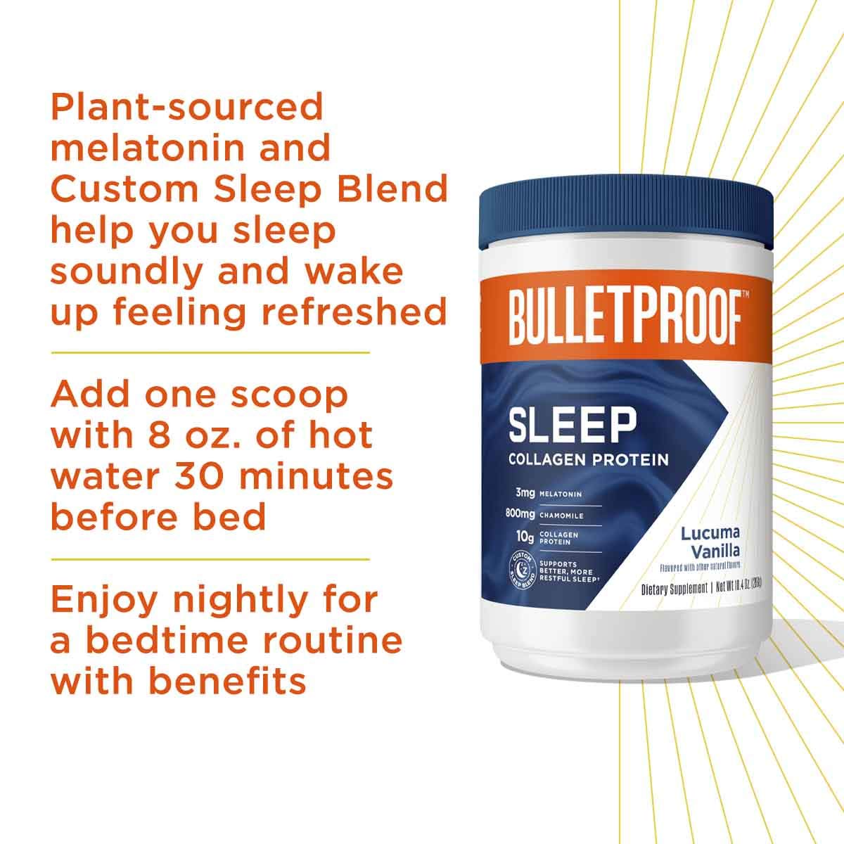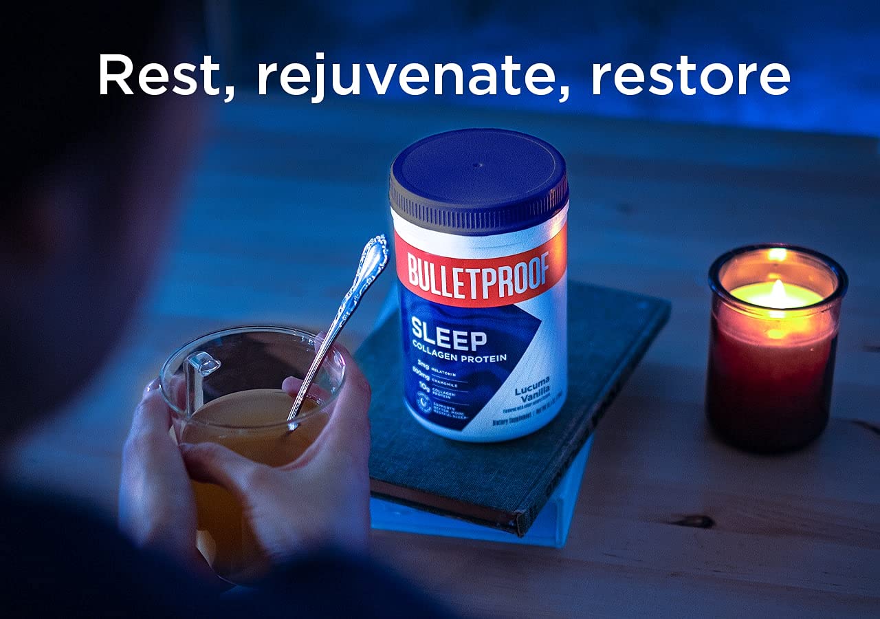 - 放鬆、休息、恢復活力:防彈好眠膠原蛋白粉將修護性的膠原蛋白與令人放鬆的褪黑激素、洋甘菊和鎂相互結合,可以幫助您睡得安穩,醒來時精神煥發