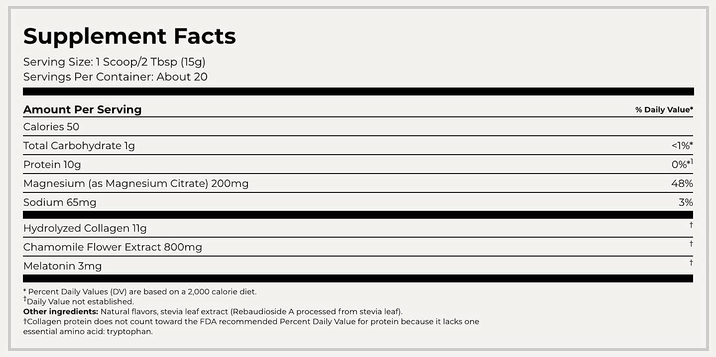 主要成分:3mg 褪黑激素、800mg 洋甘菊花提取物、鎂、11g 膠原蛋白、蛋黃果、香草